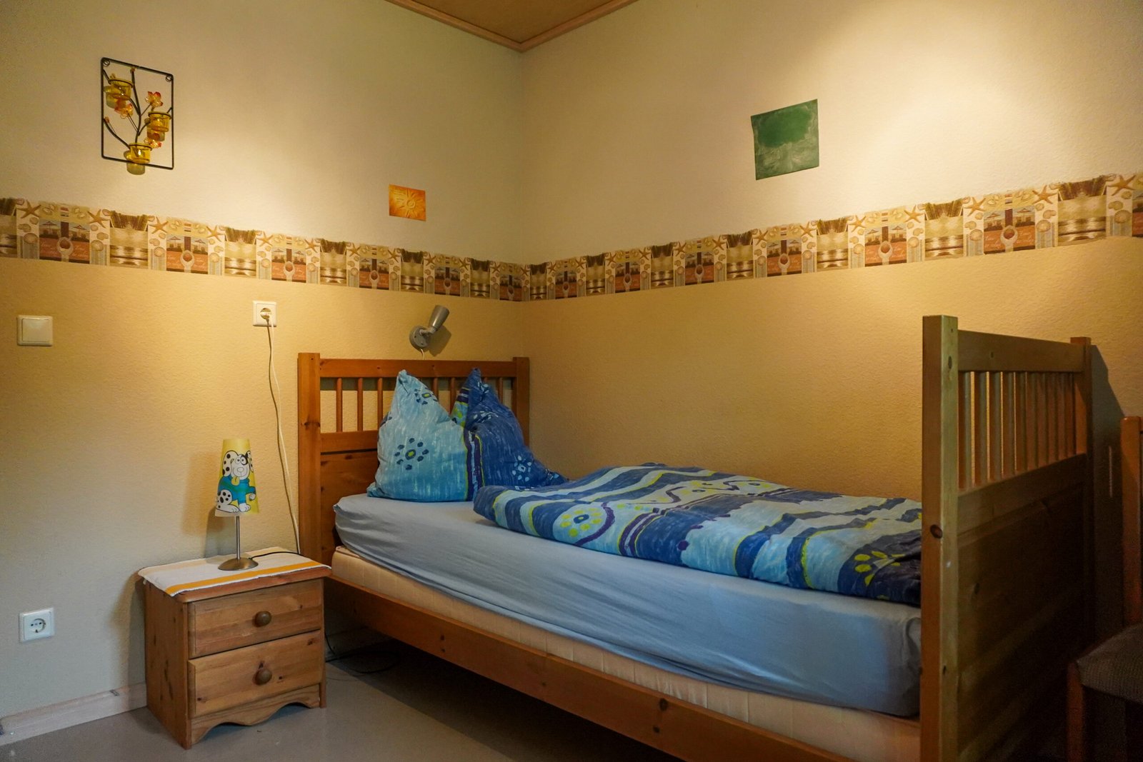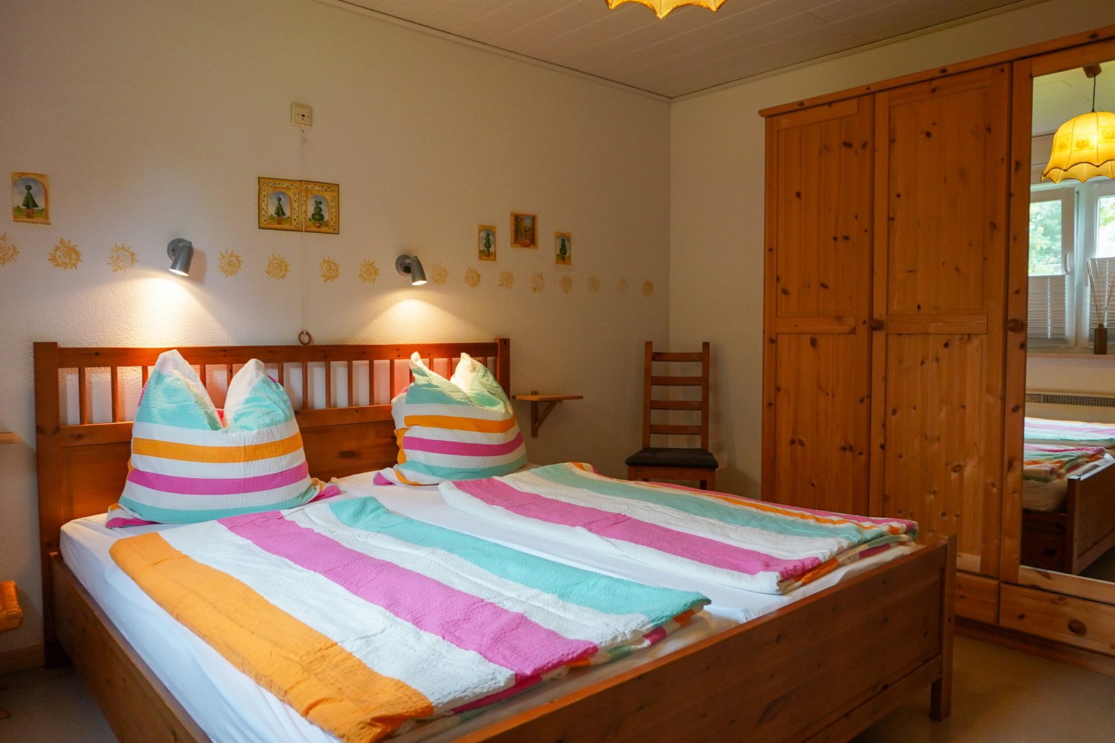 Unsere Schlafzimmer sind mit eigener Bettwäsche ausgestattet und für eine ruhige Nacht bereit. Schränke sorgen für Stauraum und der Blick fällt durchs Fenster in die Natur.